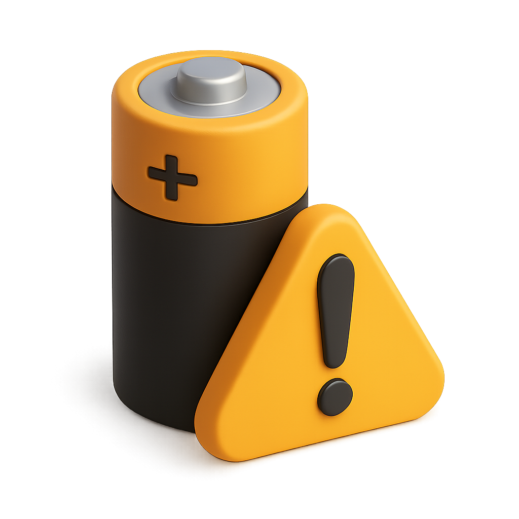 A 3D rendering of a battery with a warning sign, featuring a sleek design and vibrant colors. The battery is depicted in a three-quarter view with a transparent background.