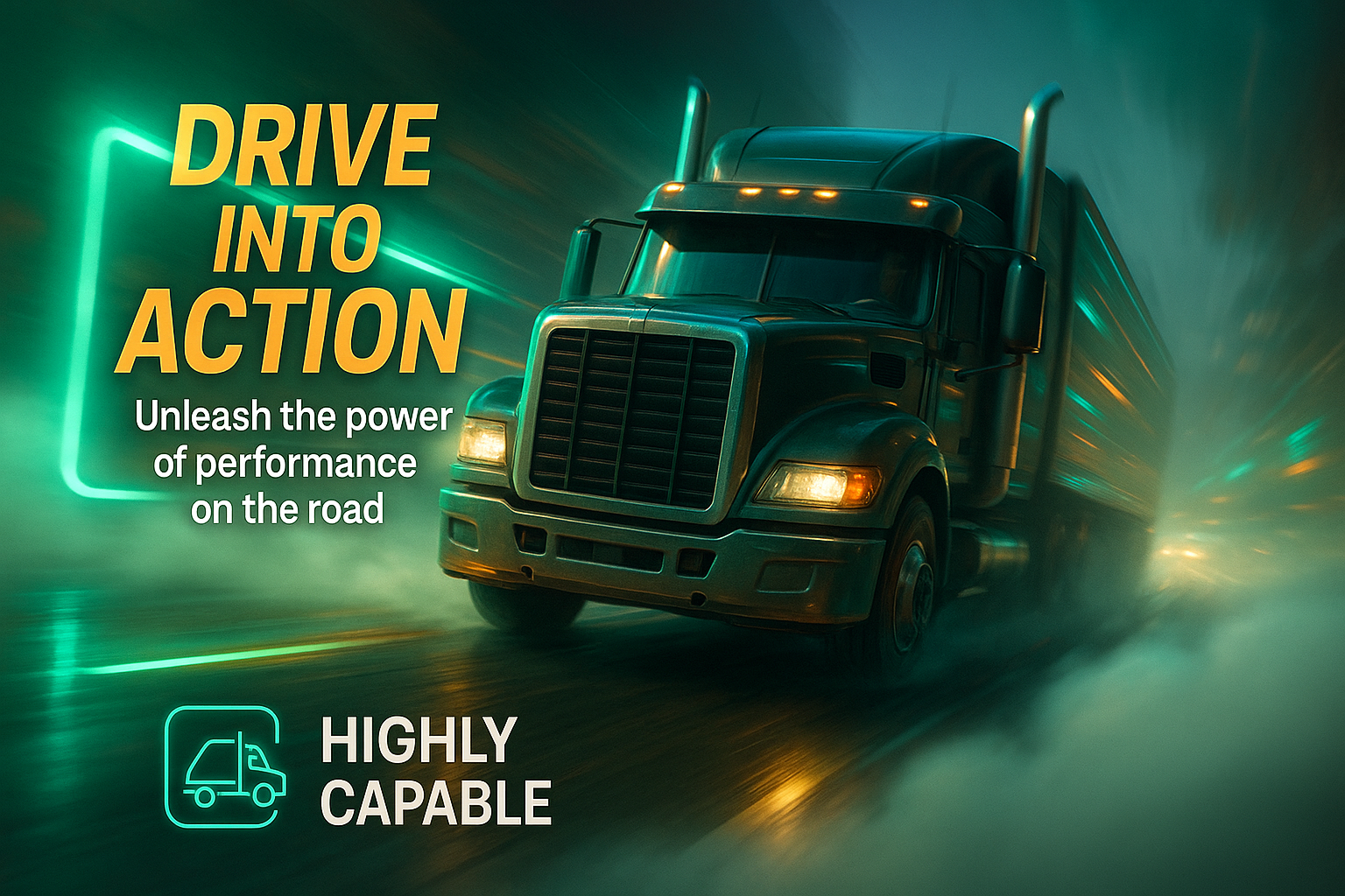 A visually striking advertisement featuring a neon-lit truck in motion. The design incorporates dynamic angles, glowing accents, and layered text blocks to engage viewers.