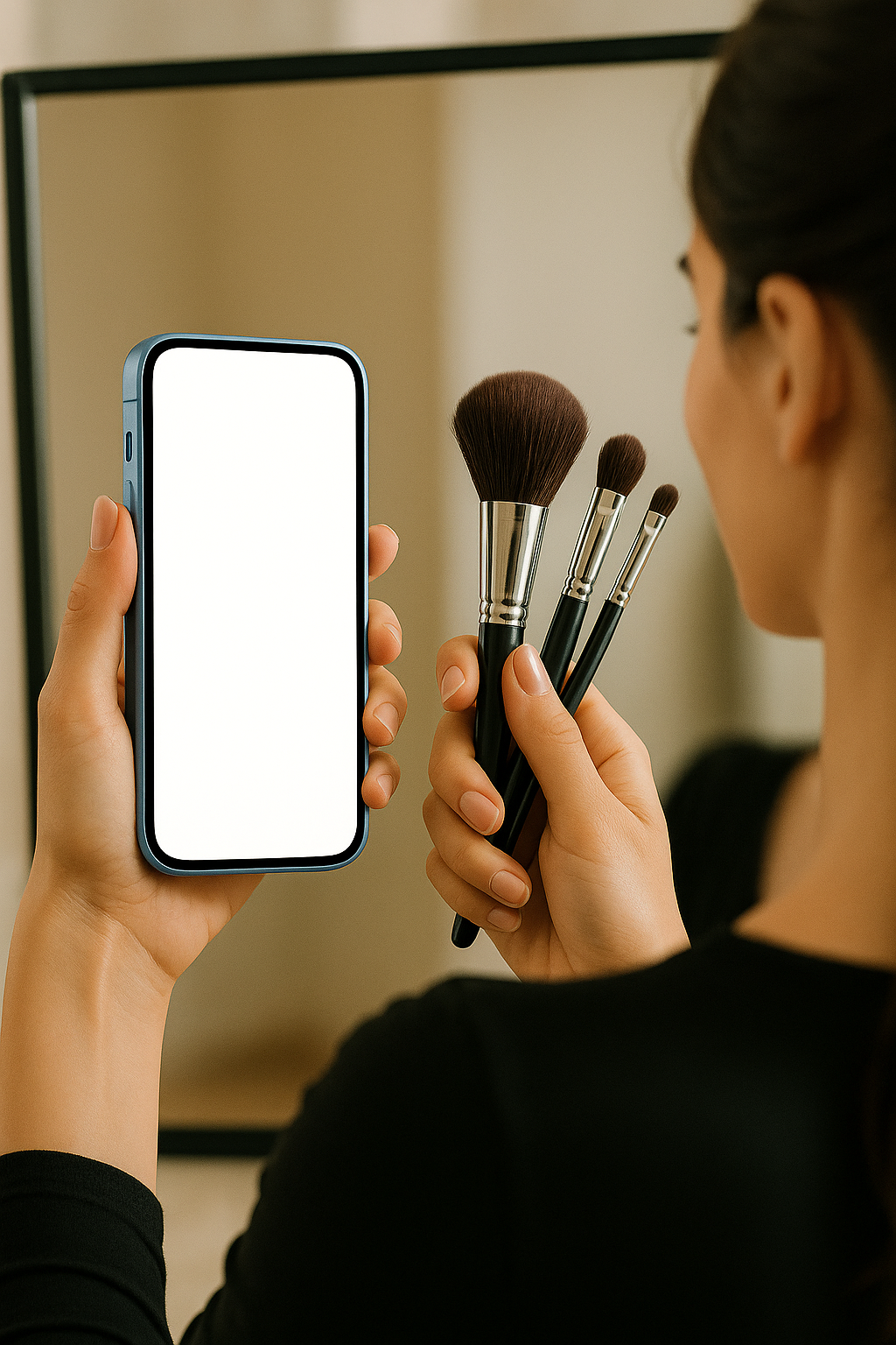 /Collection: /by davooda/Type: PNG/A makeup artist is holding a blue phone with a blank screen and makeup brushes in front of a mirror. The shot is taken from behind, showcasing a dynamic perspective.