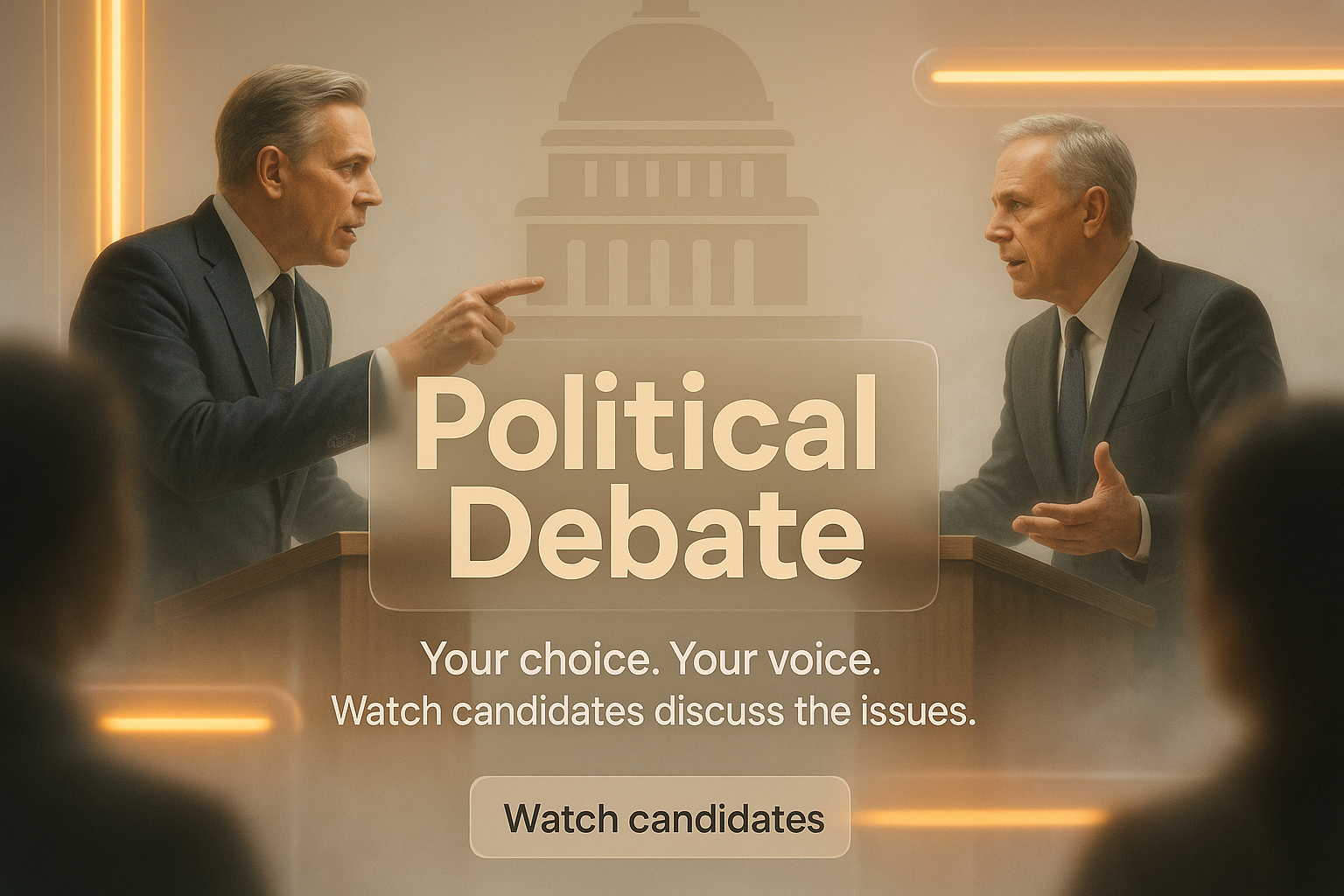 Engaging promotional graphic for a political debate featuring two candidates in discussion, designed for social media or event promotion.