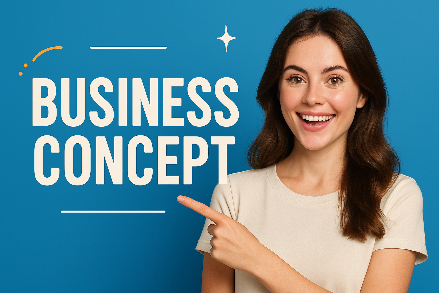 A vibrant promotional image showcasing a young woman pointing at the words 'Business Concept' against a blue background, ideal for marketing or business-related content.