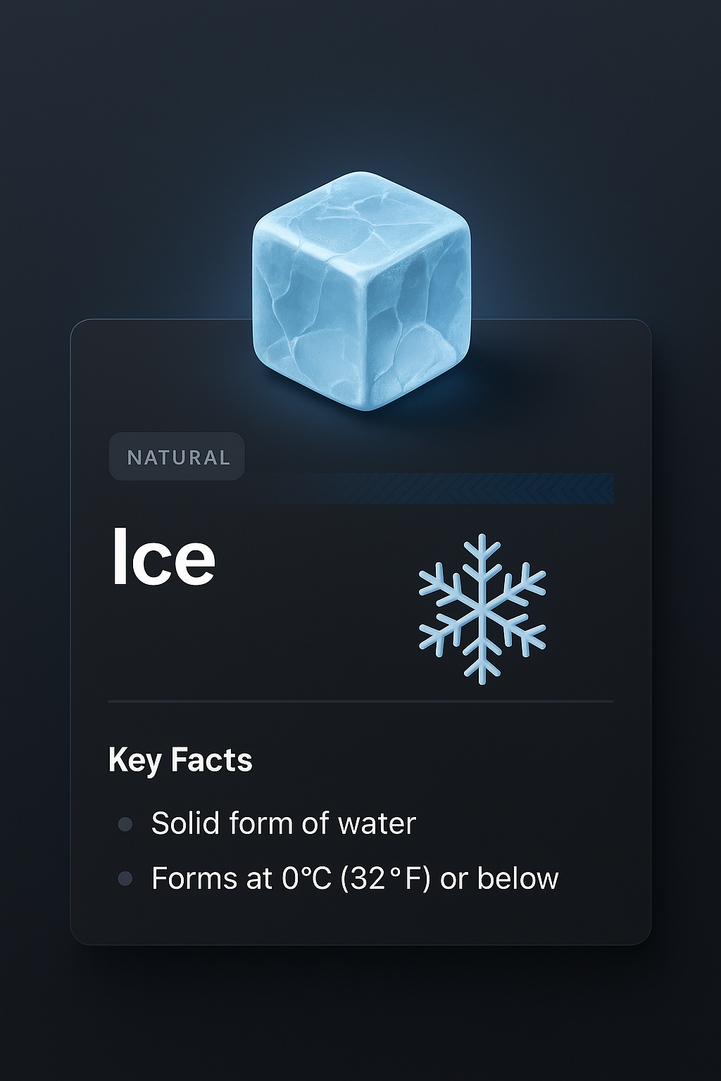 A visually striking 3D ice cube icon set against a dark gradient background, featuring an informative label detailing key facts about ice.