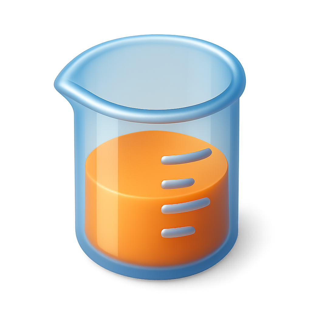 A sleek, transparent 3D beaker icon viewed from a three-quarter angle, featuring vibrant orange liquid and marked measurement lines, exuding a modern isometric style.