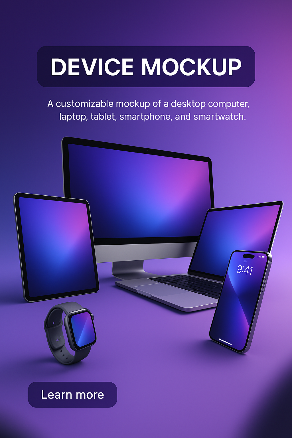A visually appealing mockup showcasing a desktop computer, laptop, tablet, smartphone, and smartwatch. Ideal for tech marketing and design presentations.
