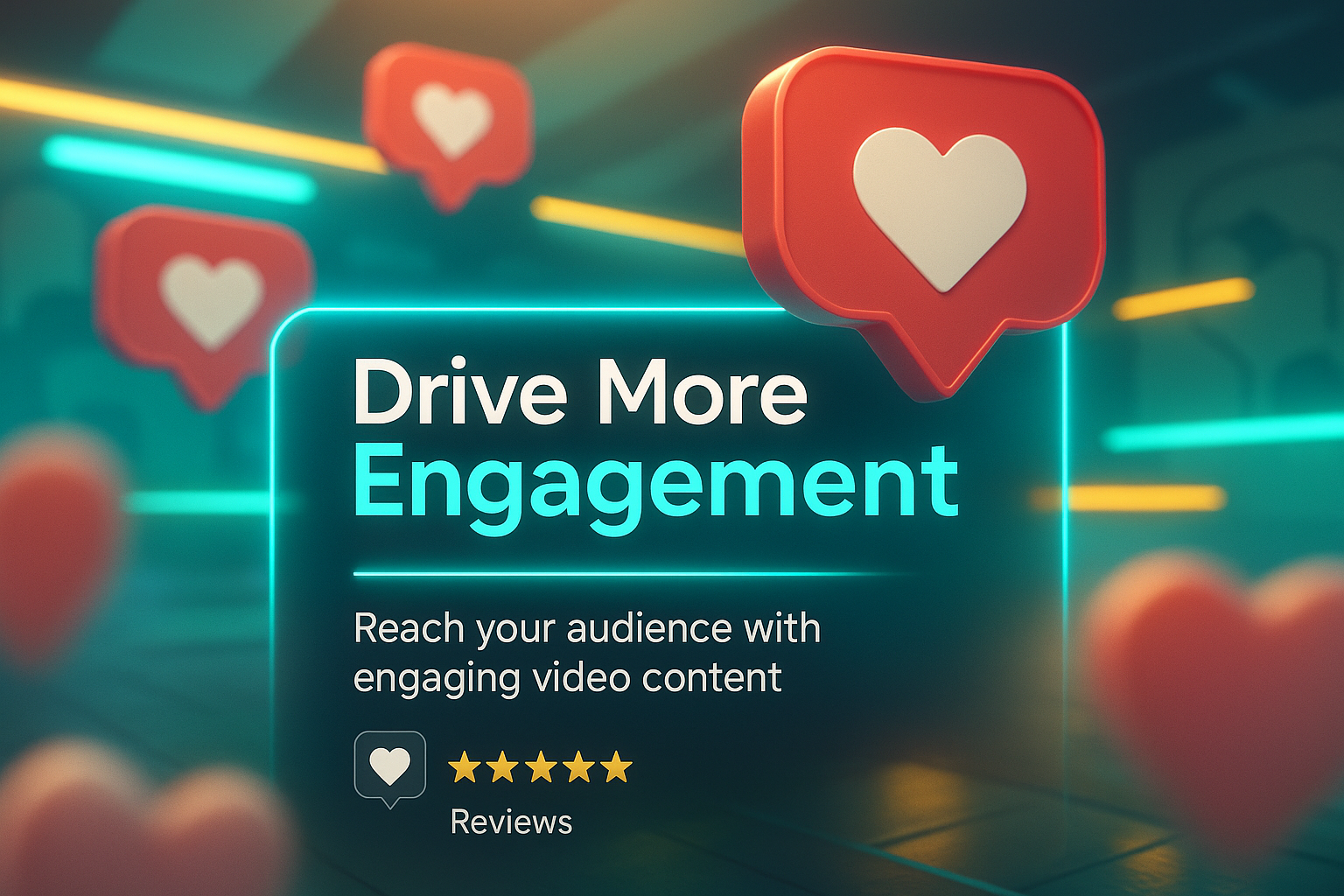 Vibrant promotional graphic showcasing engagement strategies for video content. Features heart icons and glowing elements, ideal for social media marketing.