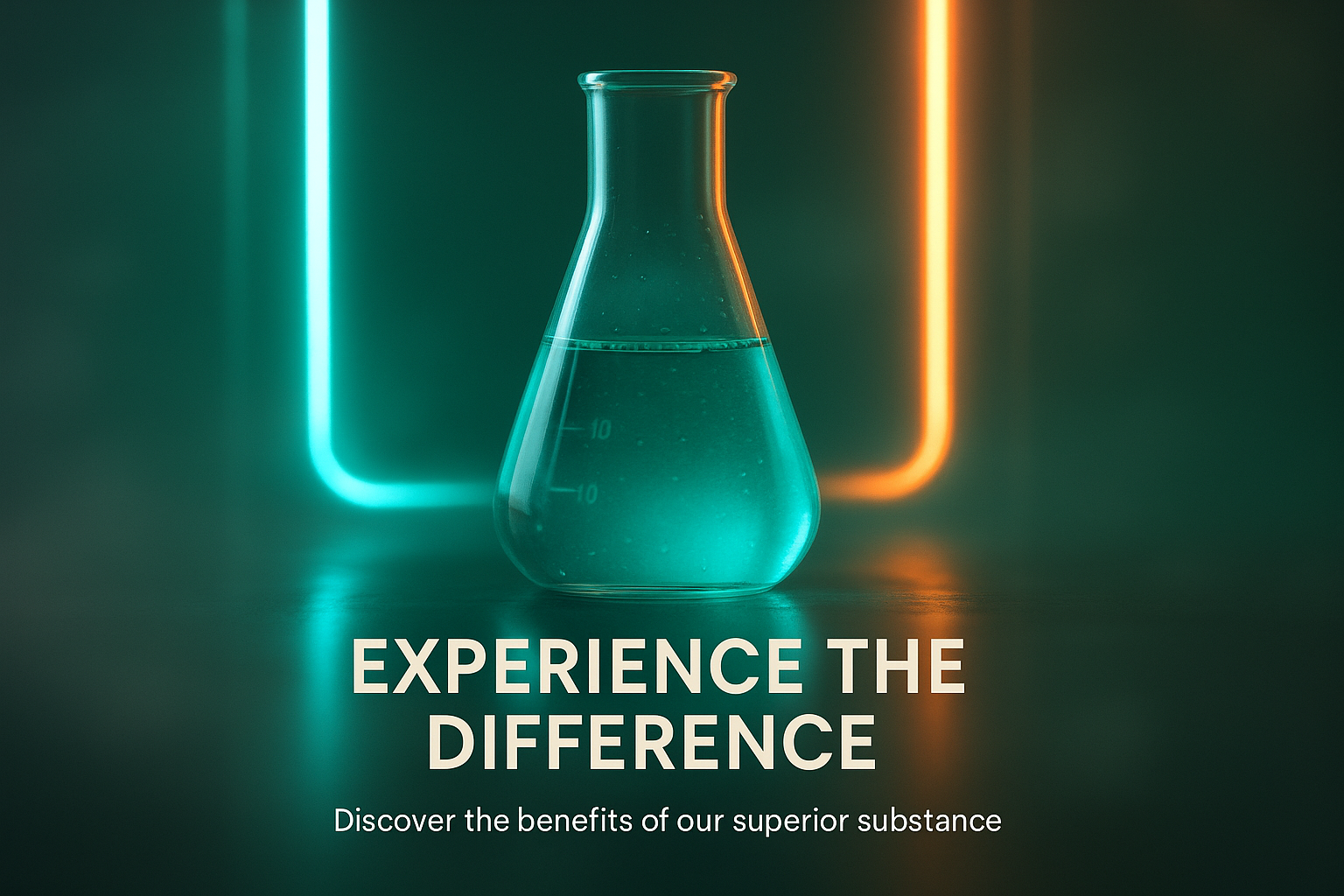 A visually striking image featuring a laboratory beaker illuminated by neon lights. The glowing accents create a captivating atmosphere, enhancing the display of the substance inside.