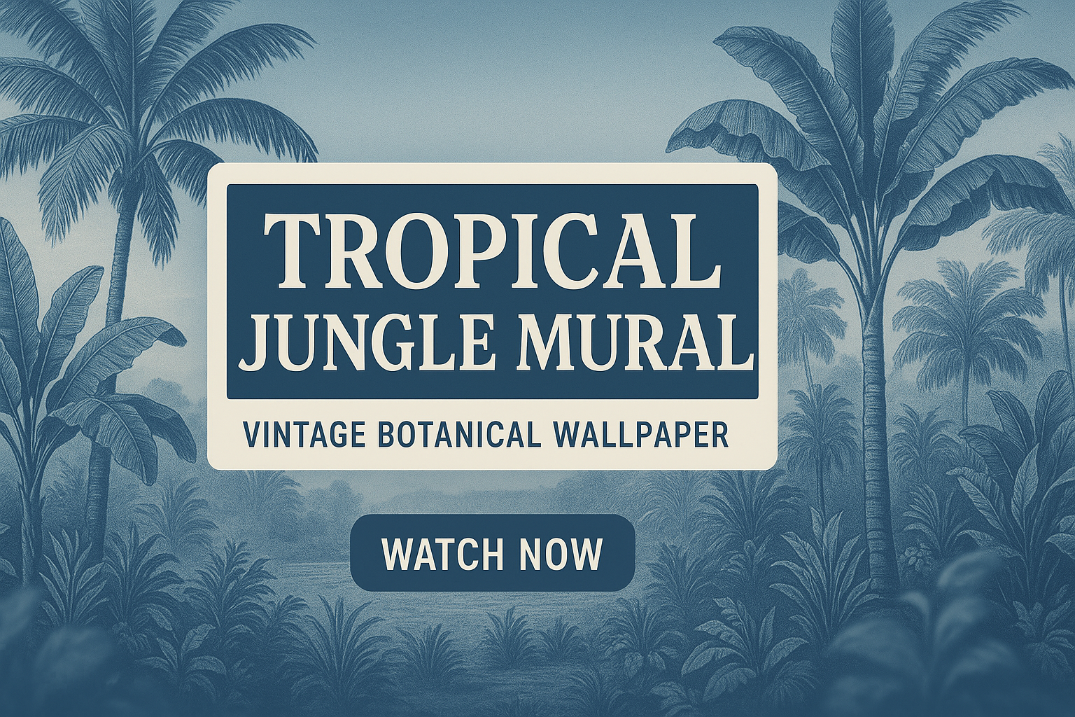 A promotional graphic featuring a vintage tropical jungle mural. The design includes lush palm trees and a serene color palette, ideal for home decor marketing.