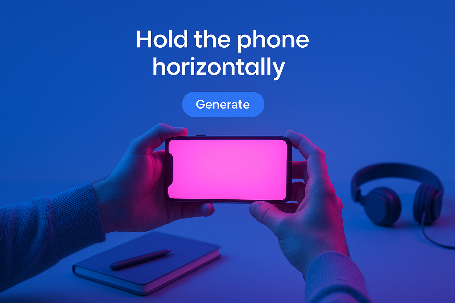 A person holds a phone horizontally against a blue background, featuring a glowing pink screen. Headphones and a notebook are nearby, creating a cohesive neon atmosphere.