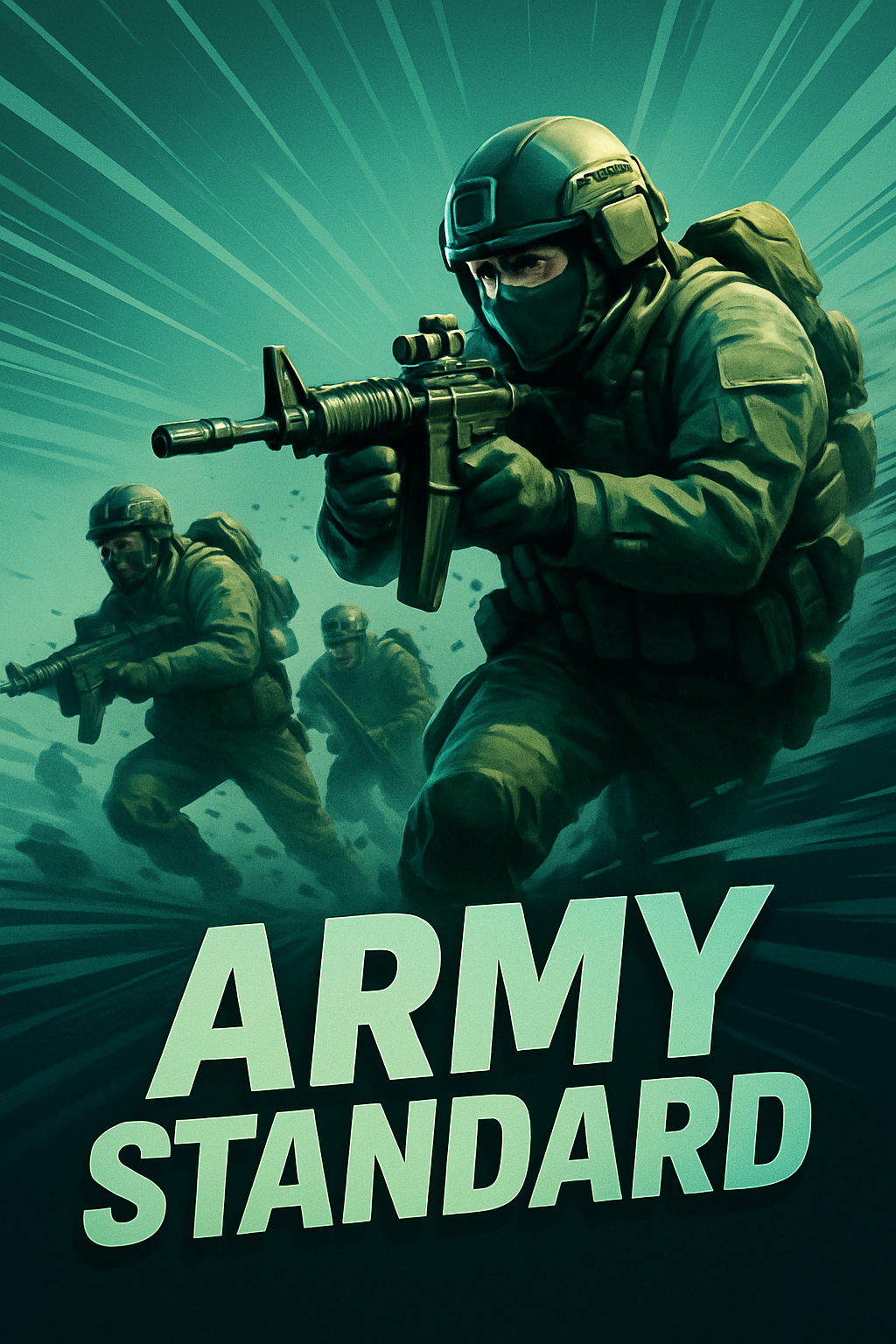 /Collection: /by davooda/Type: PNG/An action-packed illustration featuring soldiers in tactical gear, prominently displaying the text 'ARMY STANDARD' in bold font. The dynamic background enhances the sense of movement.