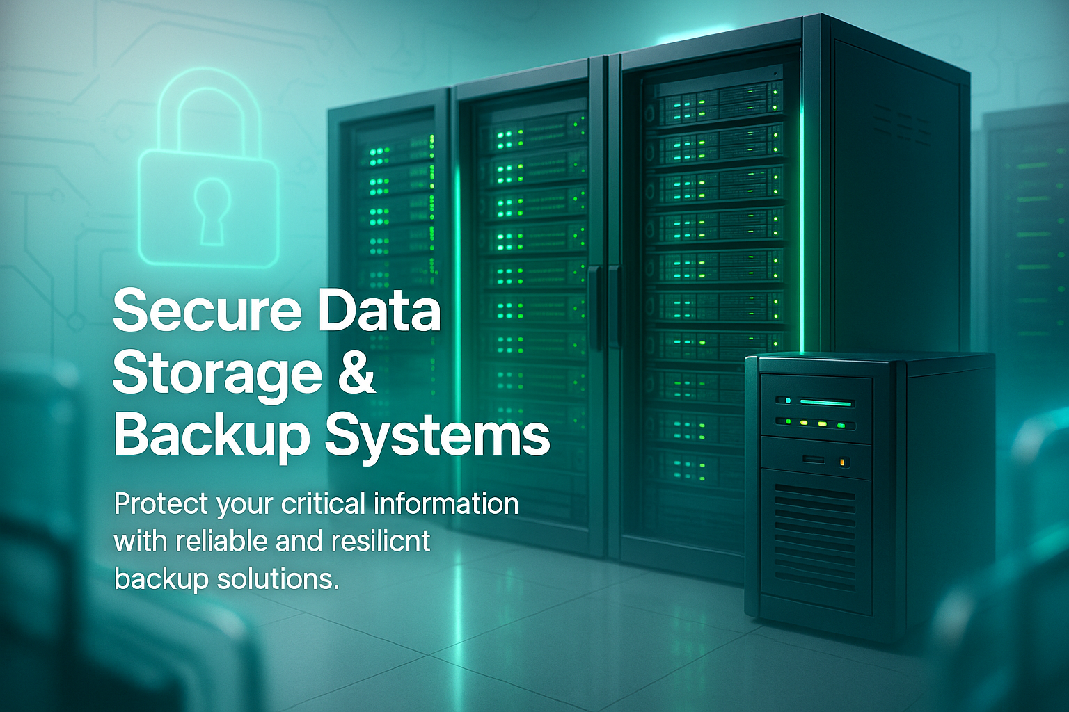A visually engaging graphic showcasing secure data storage and backup systems, featuring modern server designs with a tech-inspired color palette, ideal for IT marketing materials.