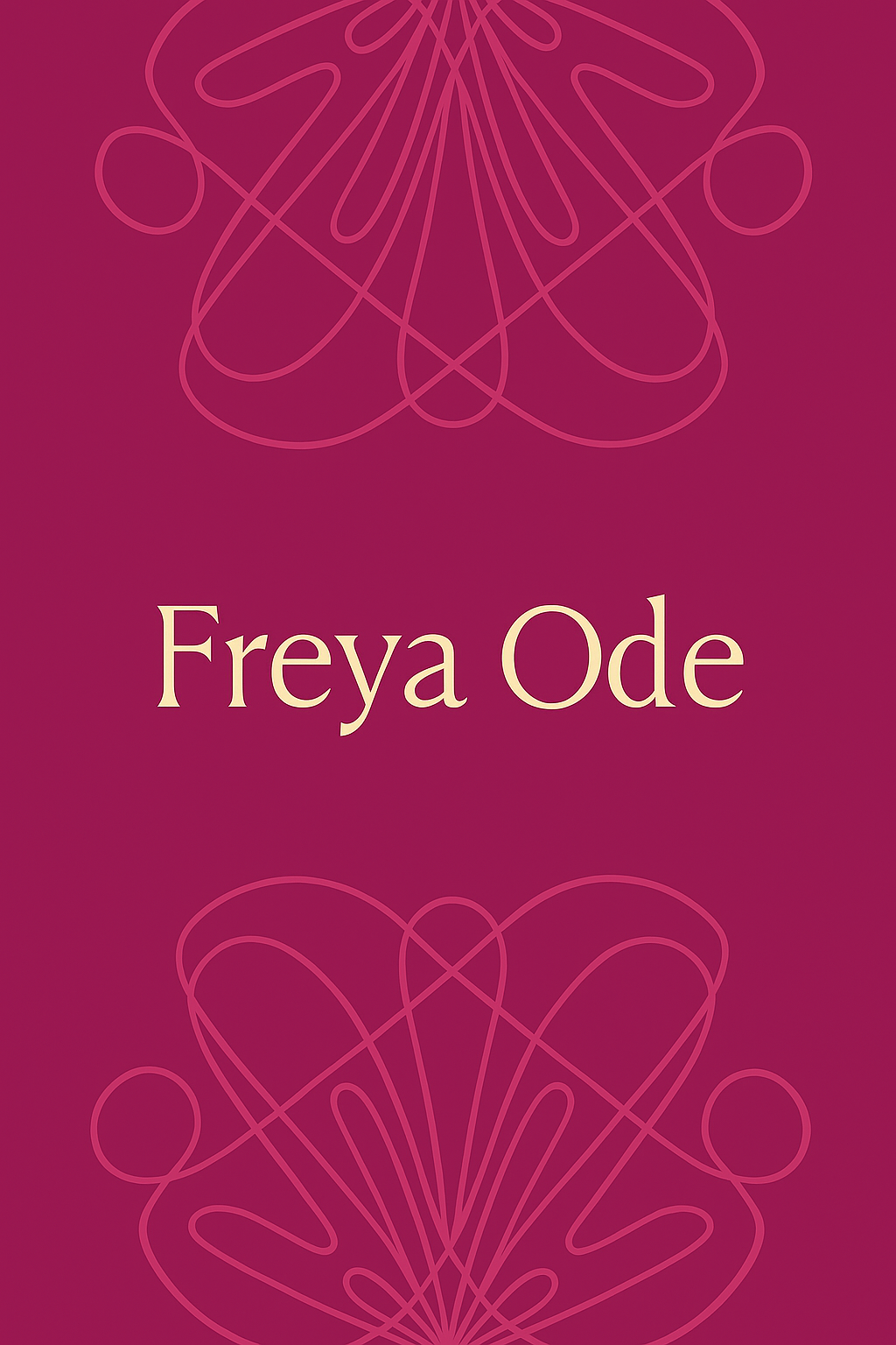 This image features intricate floral patterns in a deep maroon background, with elegant text stating 'Freya Ode' in a contrasting light color. The design exudes a sophisticated aesthetic.