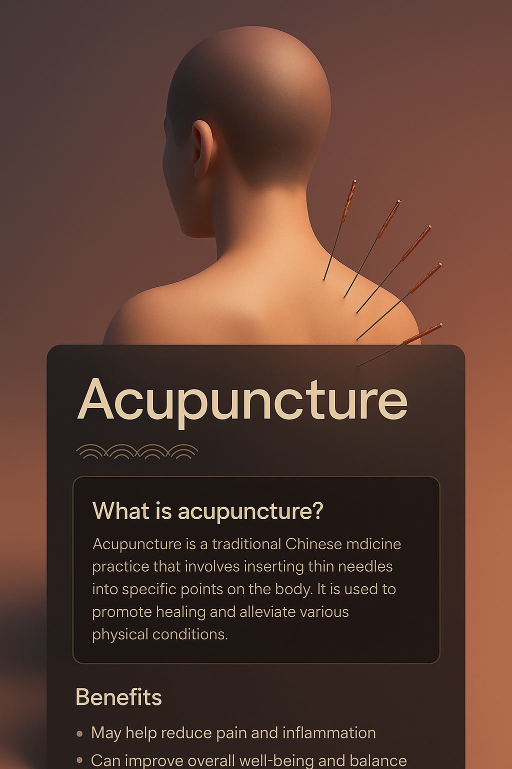/Collection: /by davooda/Type: PNG/A captivating 3D illustration of acupuncture, featuring a human model with needles inserted in the back. The design integrates text blocks with a dark overlay, presenting informative content and benefits of acupuncture.