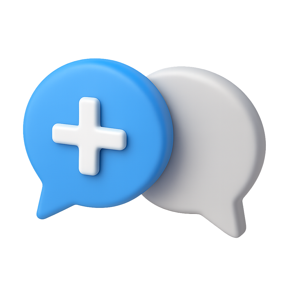 A visually engaging 3D icon featuring two speech bubbles, one blue with a plus sign, and a white one, all set against a dark background. The design emphasizes a modern isometric style.