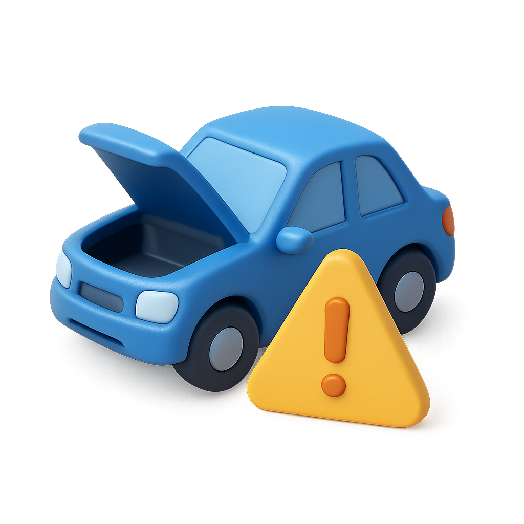 A vibrant 3D icon featuring a blue car with an open trunk next to a yellow warning sign, set against a transparent background. The design showcases a playful, isometric style.