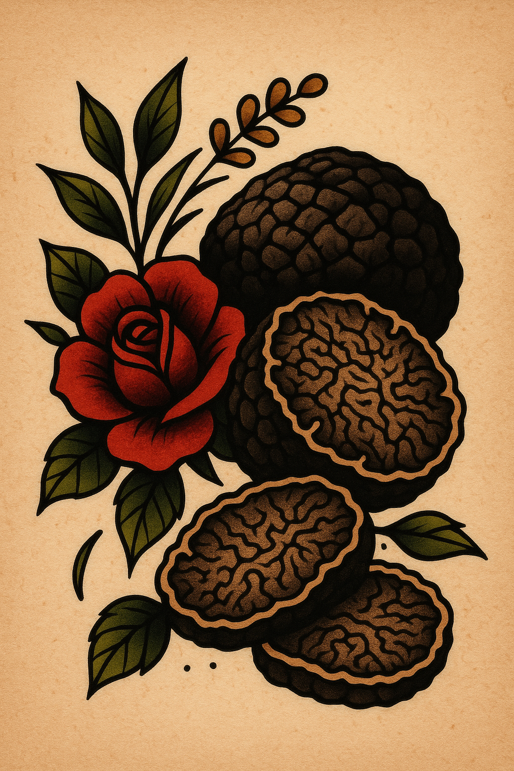 This image features a detailed illustration of cookies accompanied by a vibrant rose. It combines traditional tattoo-style elements with a vintage paper background, ideal for culinary or artistic themes.