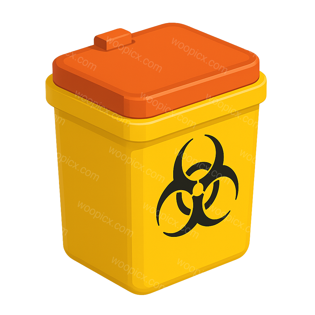 A stylized 3D biohazard container depicted in a three-quarter isometric view. The container is yellow with a red lid and features a prominent black biohazard symbol.