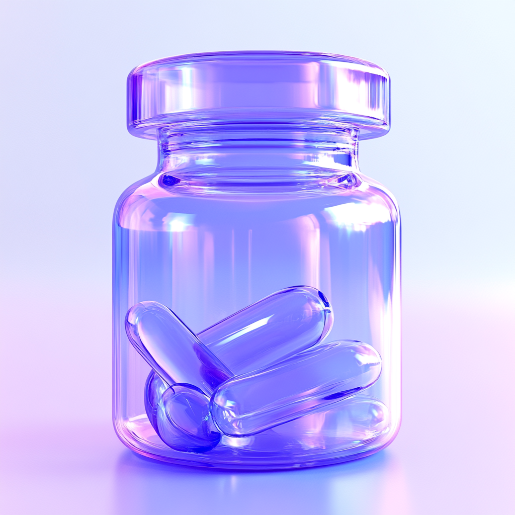 A visually appealing 3D rendering of a transparent glass jar containing capsules, set against a soft gradient background. Ideal for health and wellness related content.