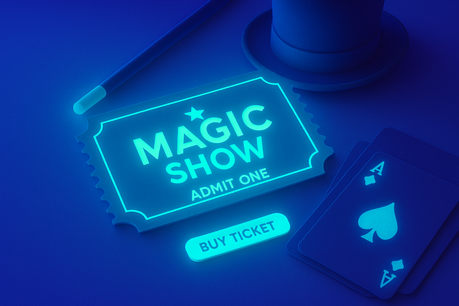 A neon aquamarine magic show ticket with the words 'MAGIC SHOW' glowing in white. Surrounded by a magician's hat and playing cards, all set against a blue background.
