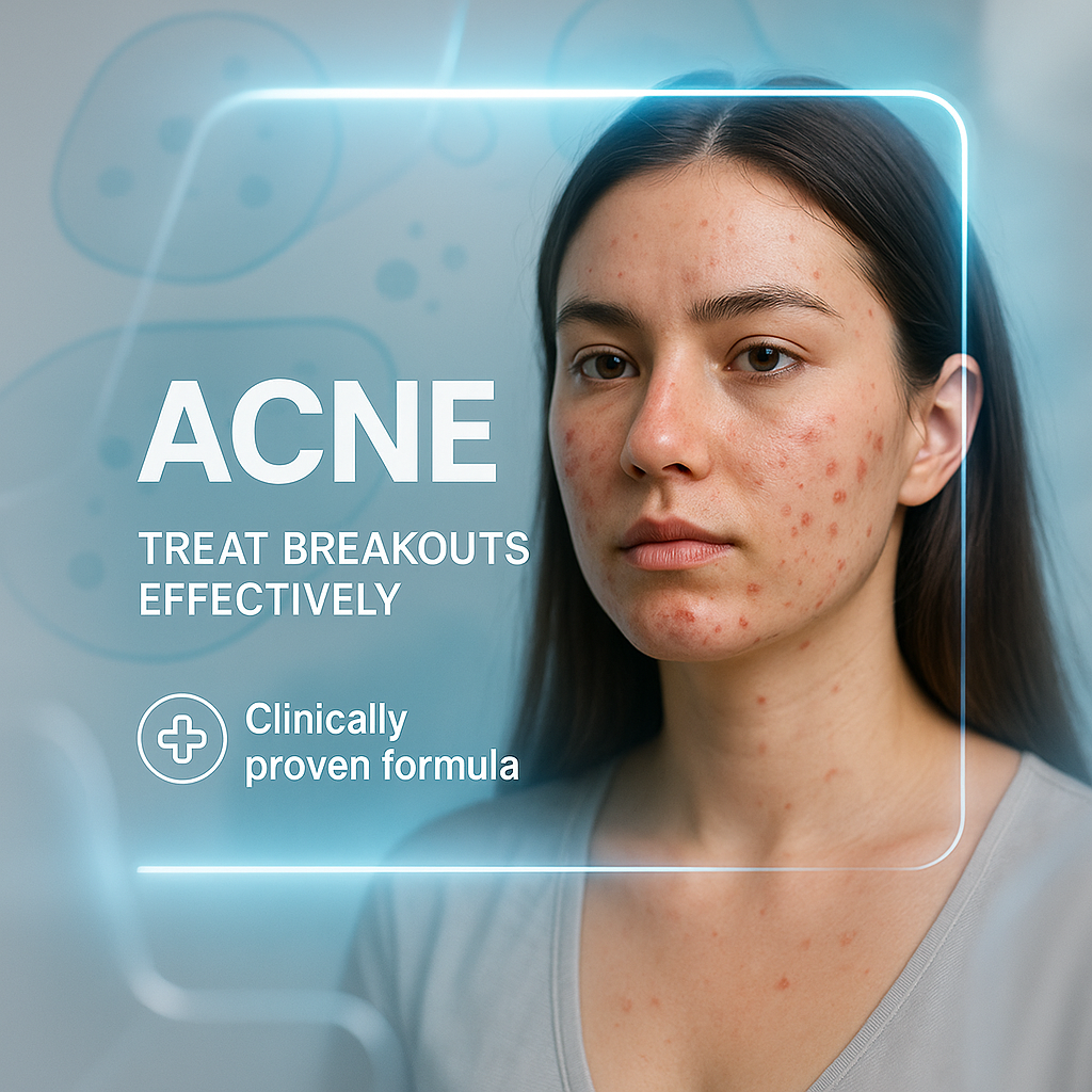 A skincare promotional image highlighting effective acne treatment, showcasing a model with acne. The modern design and clinical tone target individuals looking for skincare solutions.