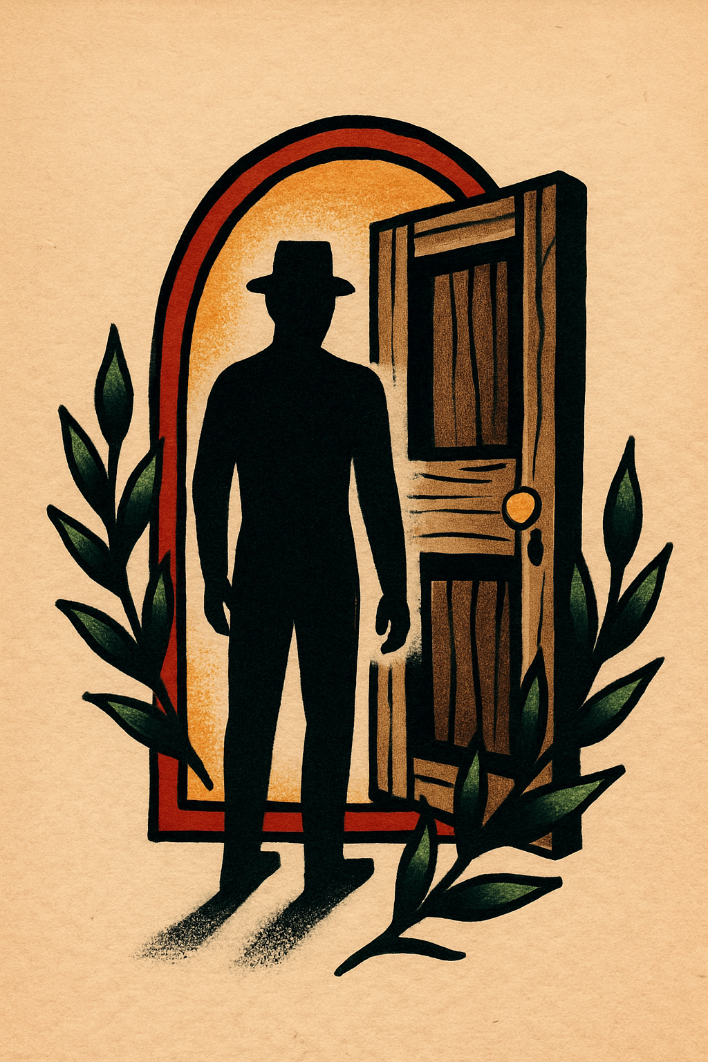 A striking silhouette of a figure standing before a closed door, framed by decorative foliage. The image features a classic tattoo style with vibrant colors against a light beige background.