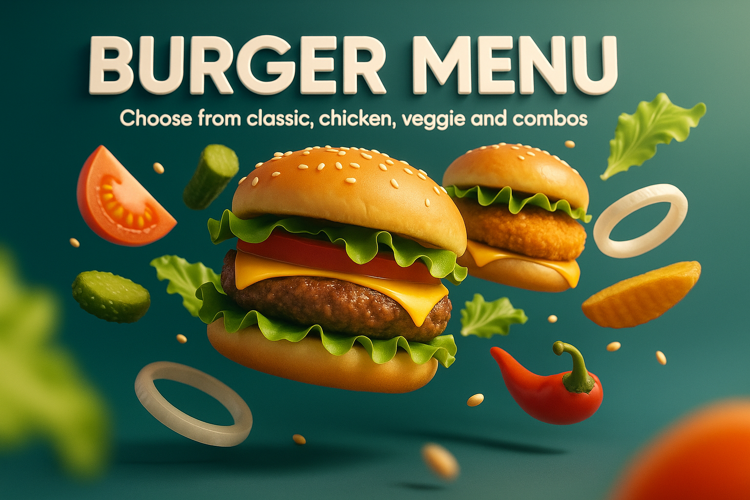 Dynamic 3D Burger Menu Illustration Featuring Classic and Veggie Options