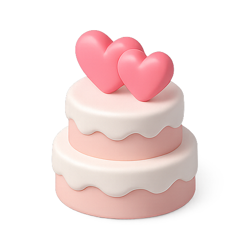 A charming 3D illustration of a two-tiered wedding cake adorned with pink heart shapes on top. Ideal for romantic celebrations, wedding invitations, or social media posts.