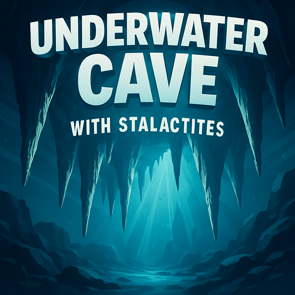 This digital artwork showcases an underwater cave filled with stalactites, emphasizing a mystical and serene atmosphere. Ideal for use in gaming or educational materials.