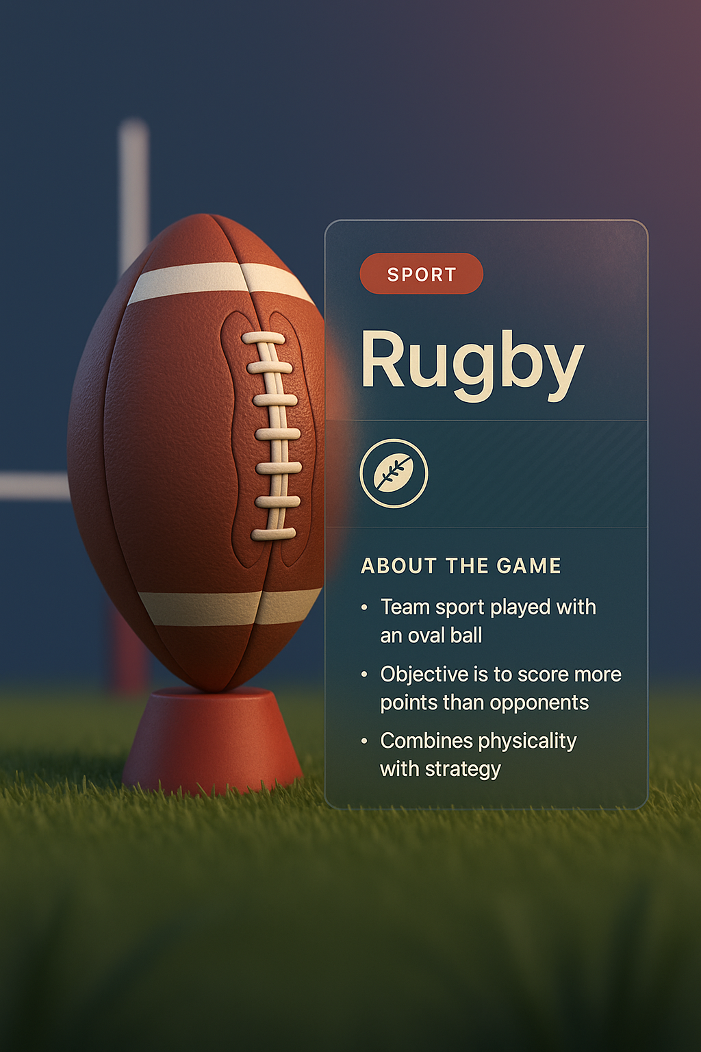 A 3D illustration of a rugby ball positioned in front of goalposts, featuring a translucent glass panel. The panel contains game details, blending seamlessly with the background.