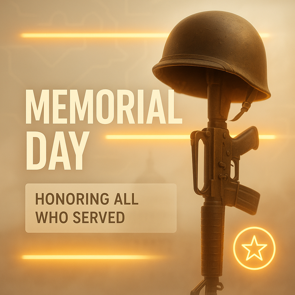 /Collection: /by davooda/Type: PNG/A visually engaging Memorial Day background featuring a soldier's helmet and rifle, with the text 'Honoring All Who Served' against a soft, glowing backdrop. The design incorporates neon light accents for a modern touch.