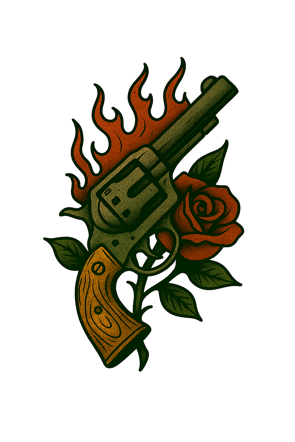 /Collection: /by davooda/Type: PNG/A vibrant tattoo design showcasing a revolver intertwined with a rose and flames, reflecting themes of rebellion and beauty. Ideal for tattoo enthusiasts or artists.
