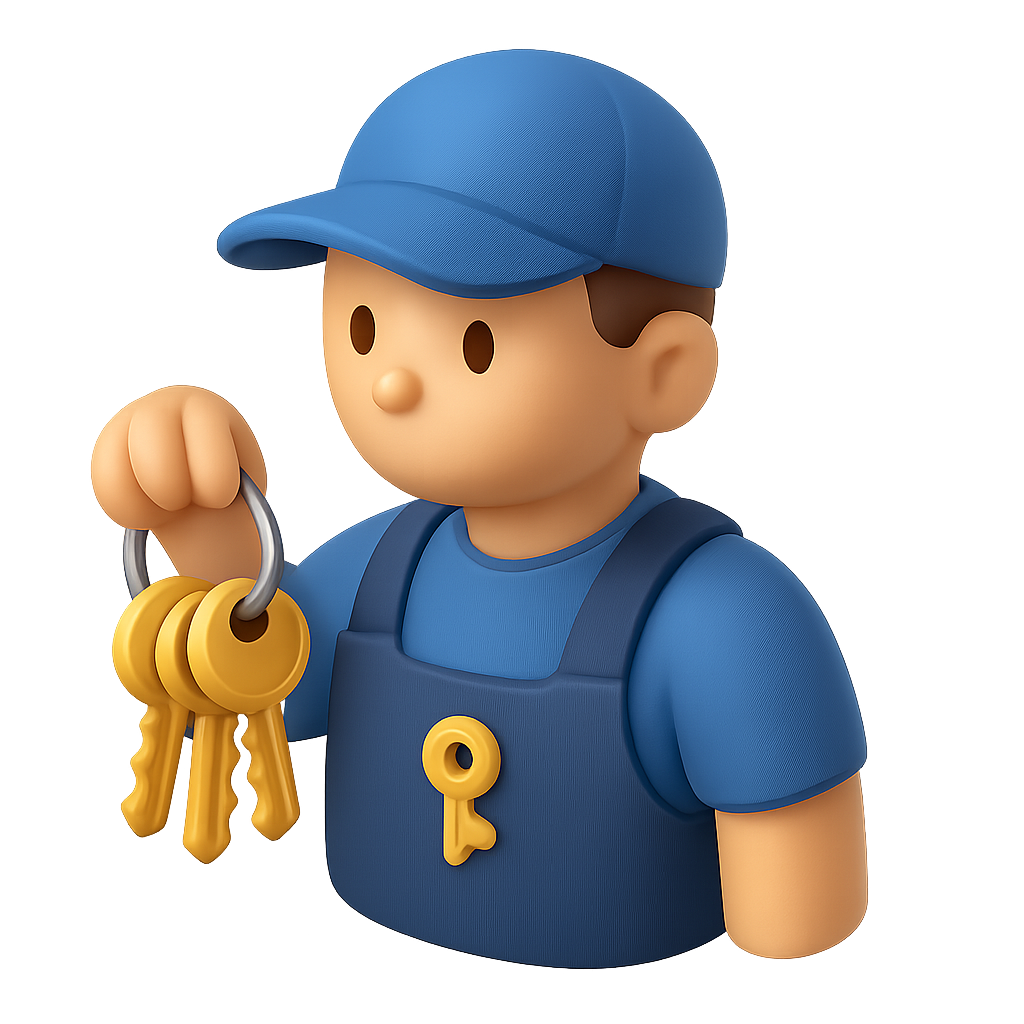 A stylized 3D locksmith figure holding a set of golden keys, presented in a three-quarter isometric view. The character wears a blue cap and uniform, showcasing a friendly demeanor.