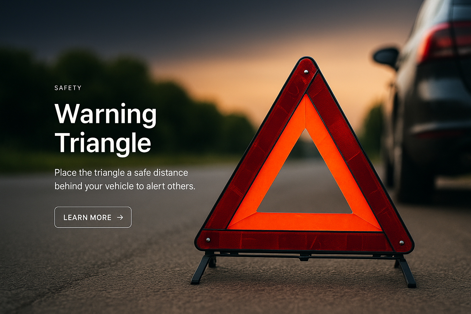 A stylish photo of a warning triangle placed on a road, with a blurred car in the background. The triangle is bright red, emphasizing safety and alertness.