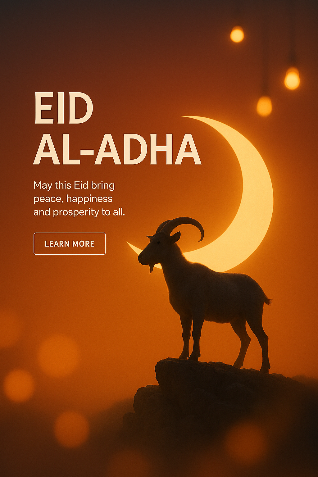 Eid Al-Adha Celebration Graphic Featuring a Goat and Moon