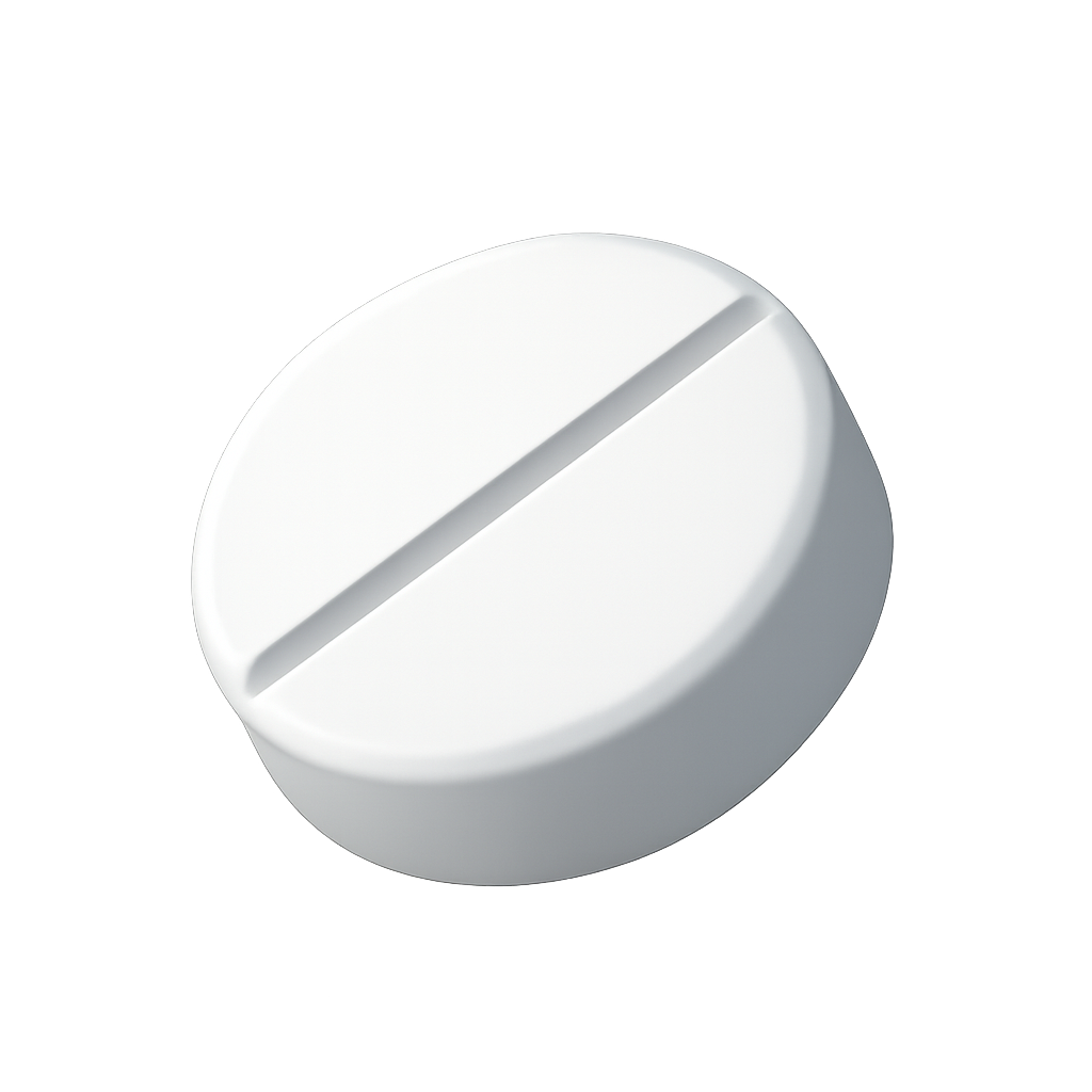 A minimalist 3D representation of an aspirin pill, featuring a smooth, white surface with a distinctive groove, set against a subtle gradient background.