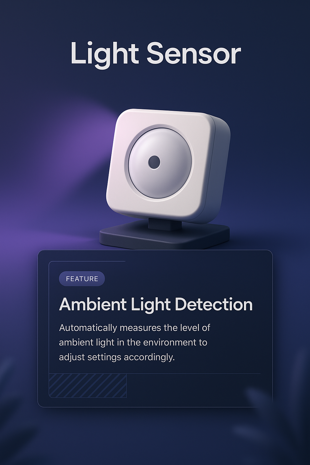 A sleek 3D light sensor illustration against a smooth gradient background. The design includes a feature block detailing ambient light detection.