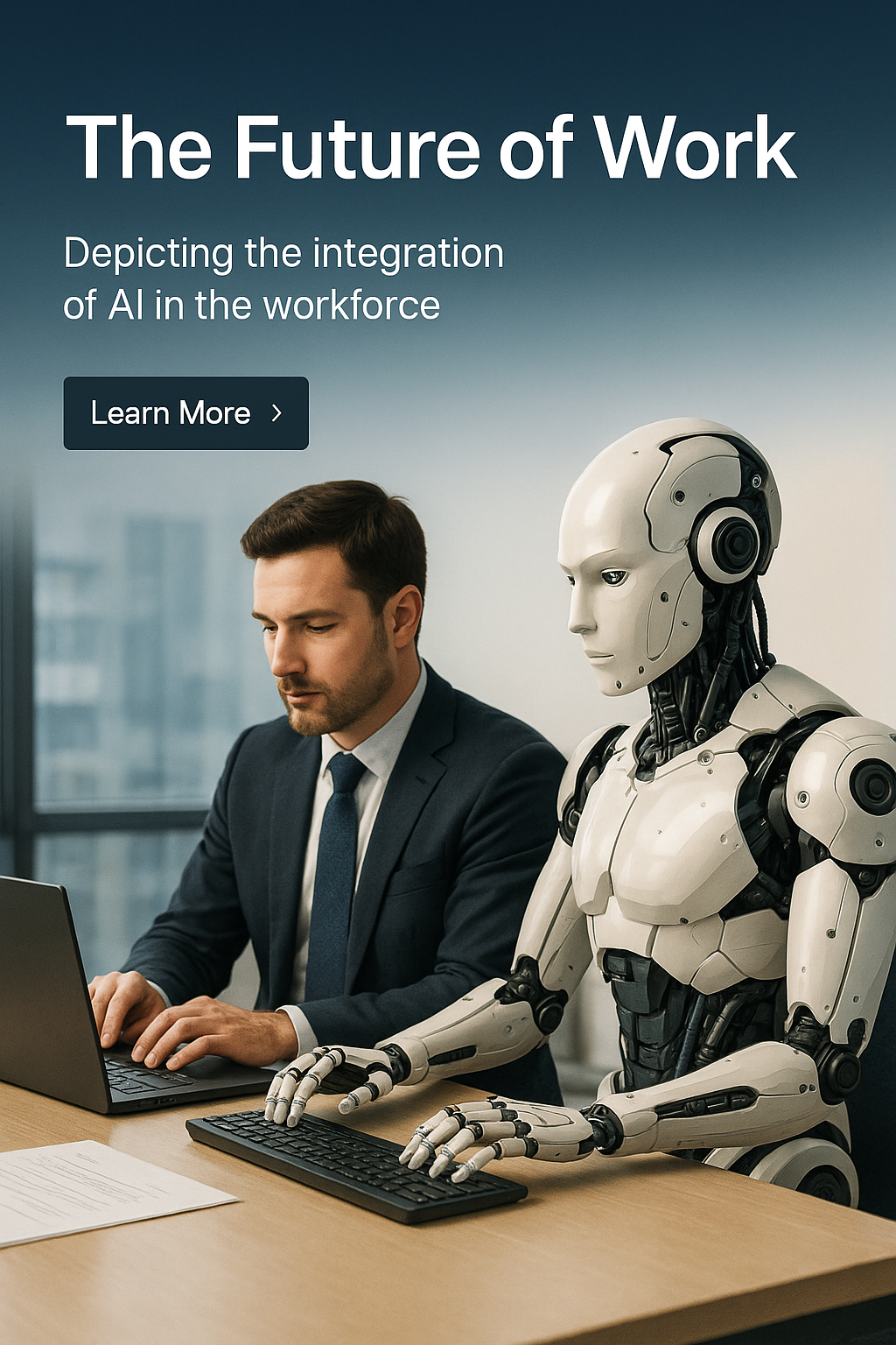 /Collection: /by davooda/Type: PNG/A businessman works alongside a humanoid AI cyborg in a sleek office, illustrating the future of work and AI's role in enhancing productivity and collaboration.