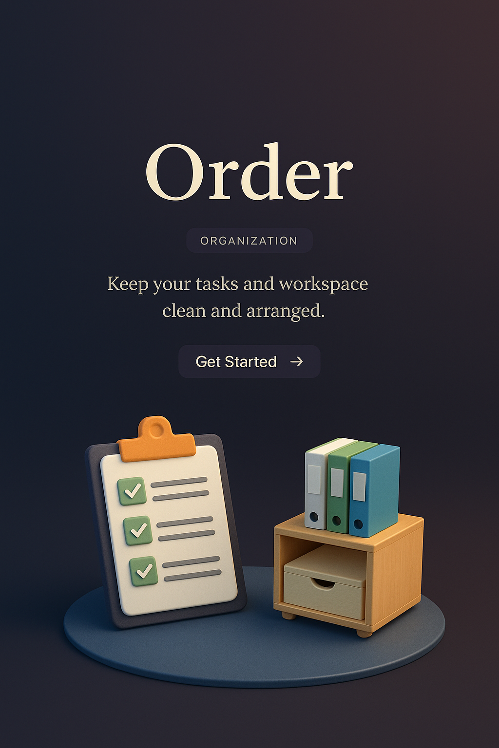 A visually appealing 3D scene showcasing an organized workspace, featuring a checklist and file storage. The design emphasizes a dark gradient background and minimalistic elements.