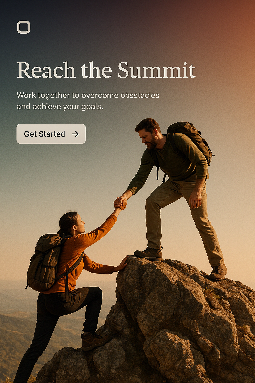 /Collection: /by davooda/Type: PNG/An illustration depicting a hiker helping a friend reach the mountain summit, showcasing teamwork and determination. The scene features a gradient background transitioning from dark to white.