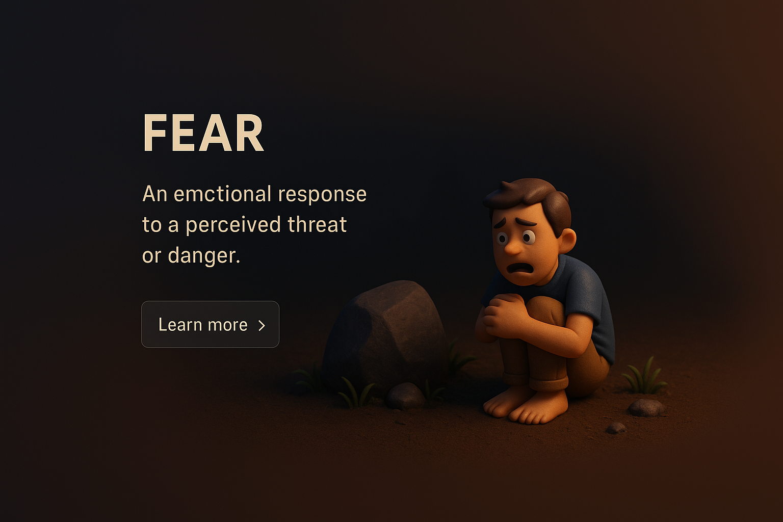 A zoomed-out 3D scene depicting fear, featuring a small character in a dark gradient background. The character is crouched, illustrating emotional response, with a clear call-to-action button.