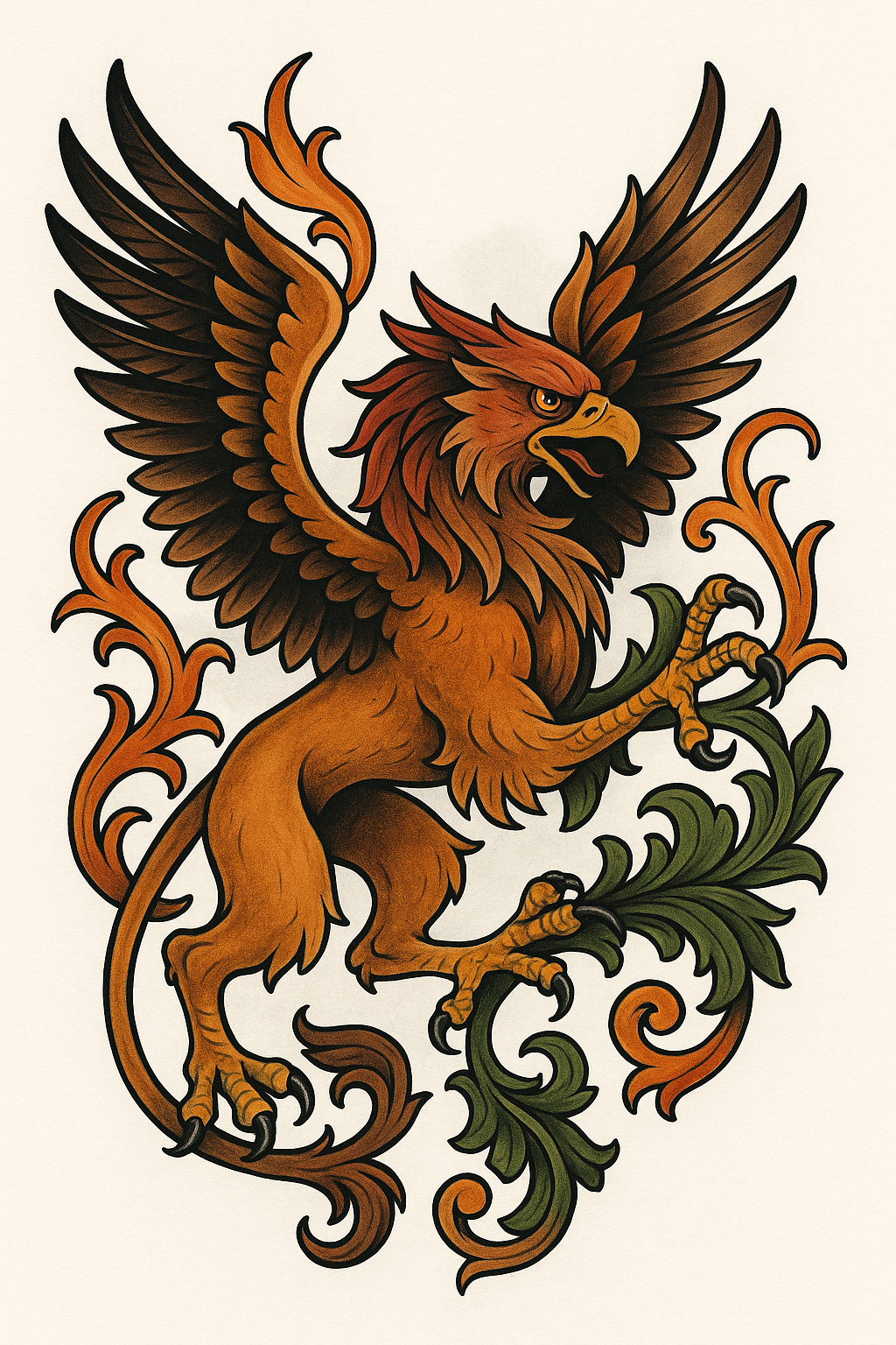 A vibrant illustration of a griffin, featuring intricate detailing and ornamental flourishes, ideal for fantasy art enthusiasts or tattoo designs.