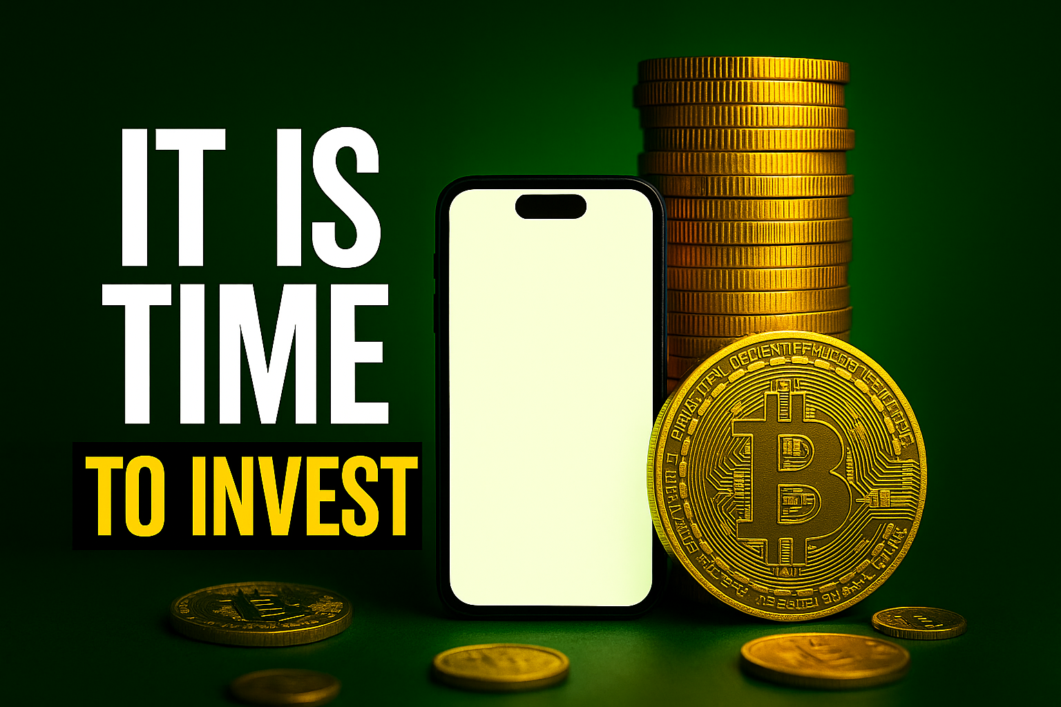 Investment Promotion Graphic Featuring Cryptocurrency and Mobile Device