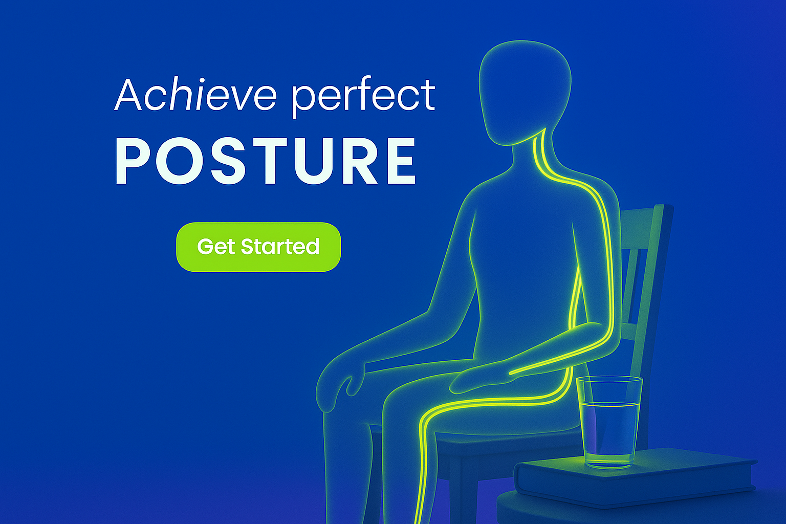 This image showcases a stylized figure demonstrating perfect posture, highlighted by neon lines. The background is a solid blue, complementing the glowing elements.