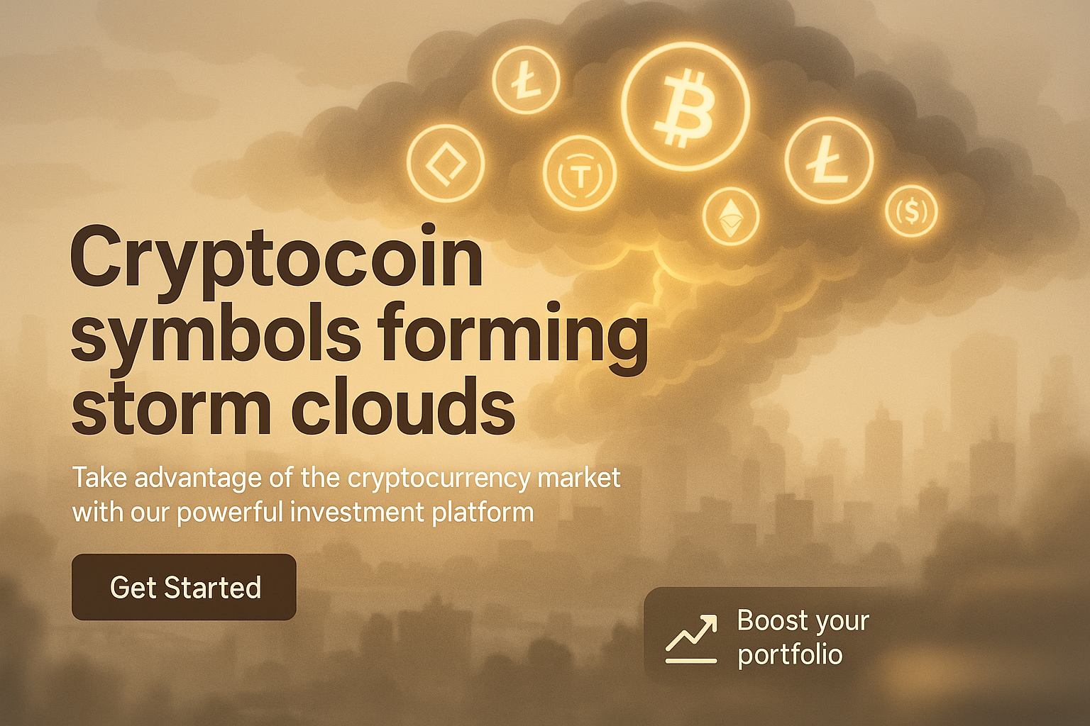 Promotional graphic featuring cryptocurrency symbols as storm clouds, designed to attract investors to an investment platform with a modern, tech-inspired style.