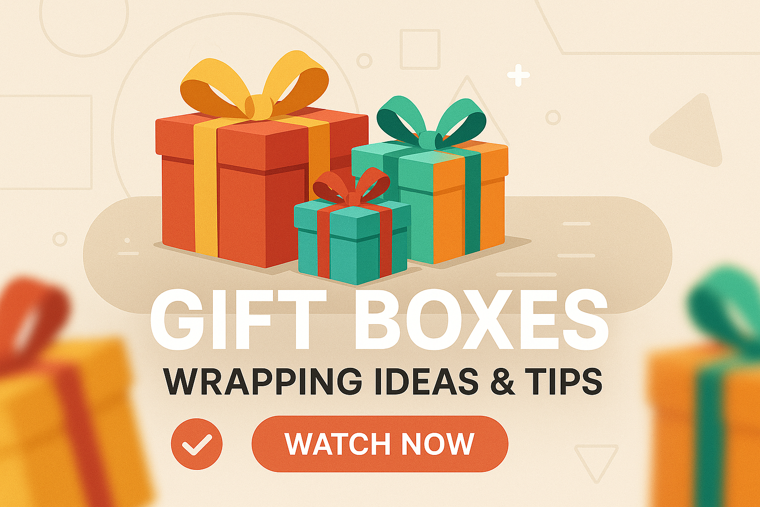 Colorful promotional graphic featuring illustrated gift boxes, designed to showcase wrapping ideas and tips. Ideal for holiday campaigns and DIY content.