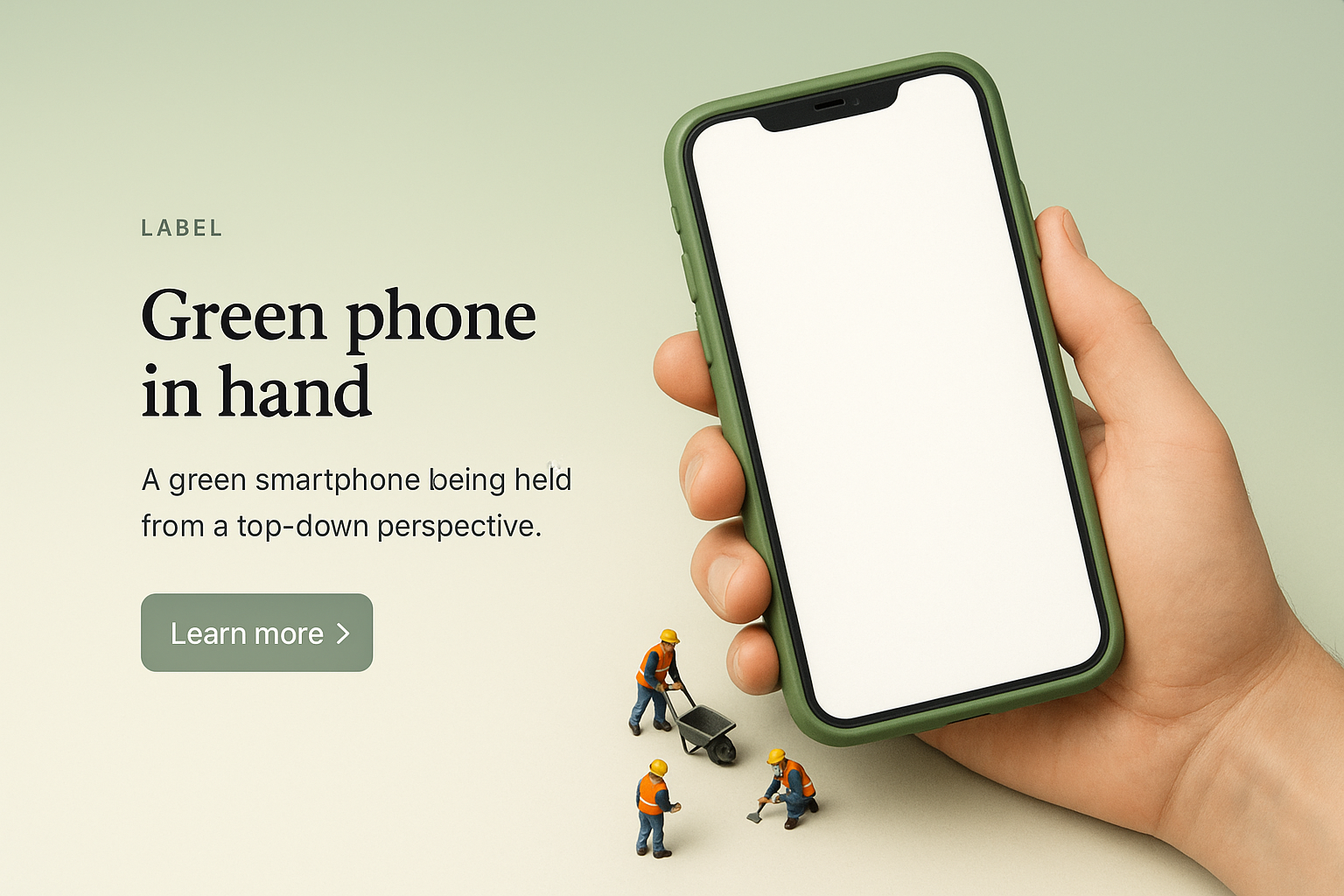 A top-down perspective of a green smartphone being held, featuring tiny figures working nearby. The clean design highlights the phone's screen and label.
