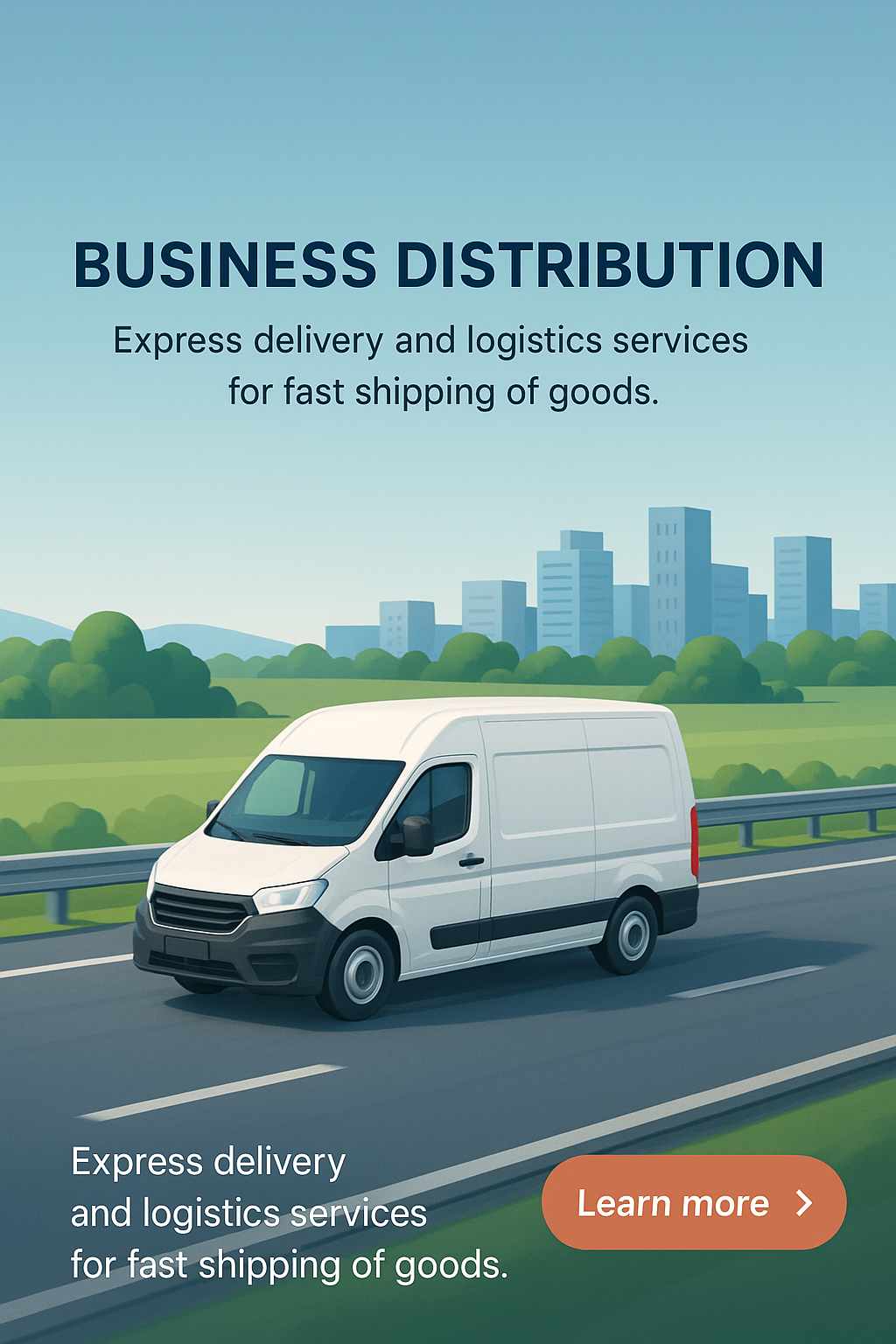/Collection: /by davooda/Type: PNG/A modern white delivery van speeds along a motorway, with a city skyline in the background. The illustration emphasizes logistics and express services on a sunny day.