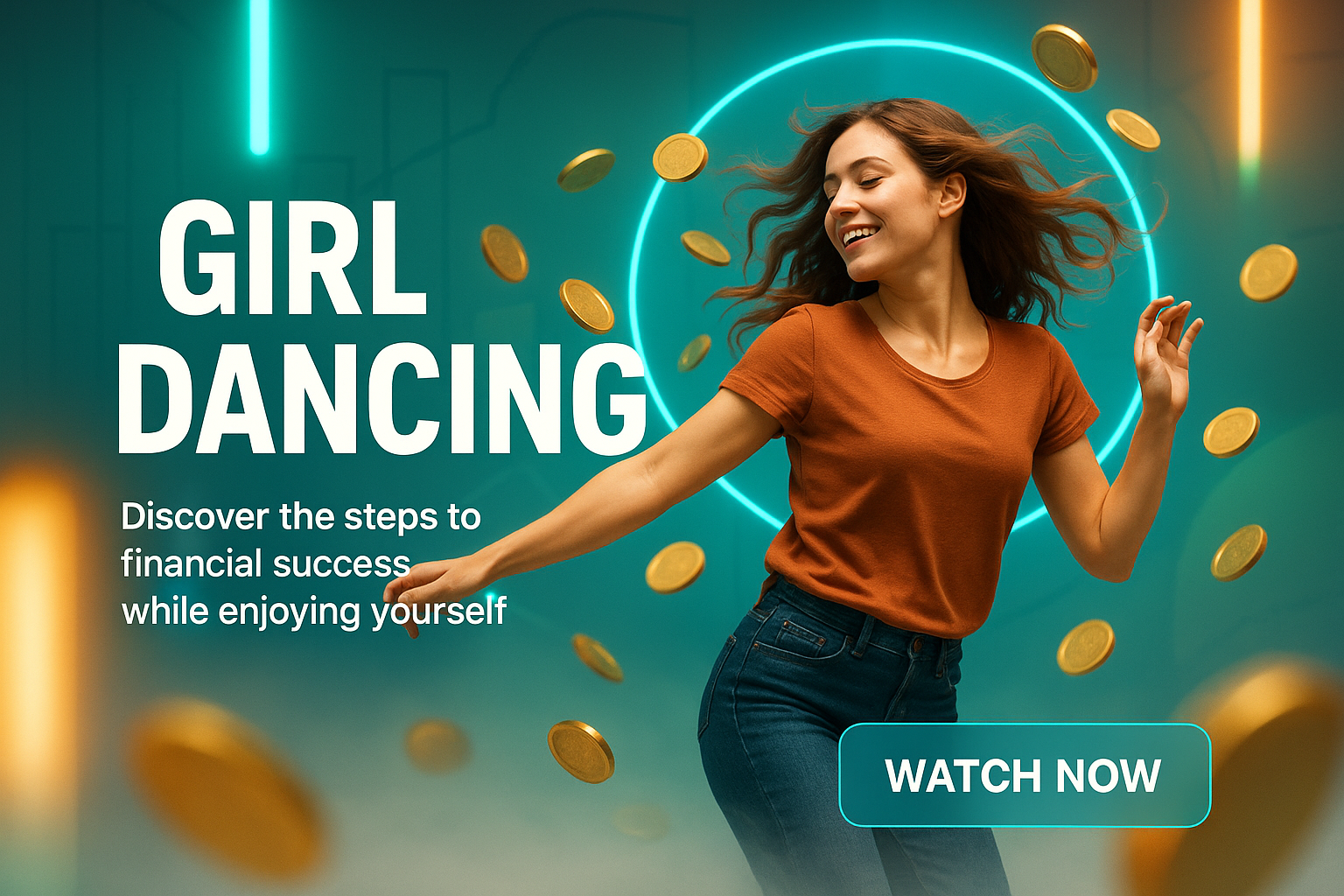 Dynamic Promotional Graphic Featuring Dancing Woman and Financial Success Theme