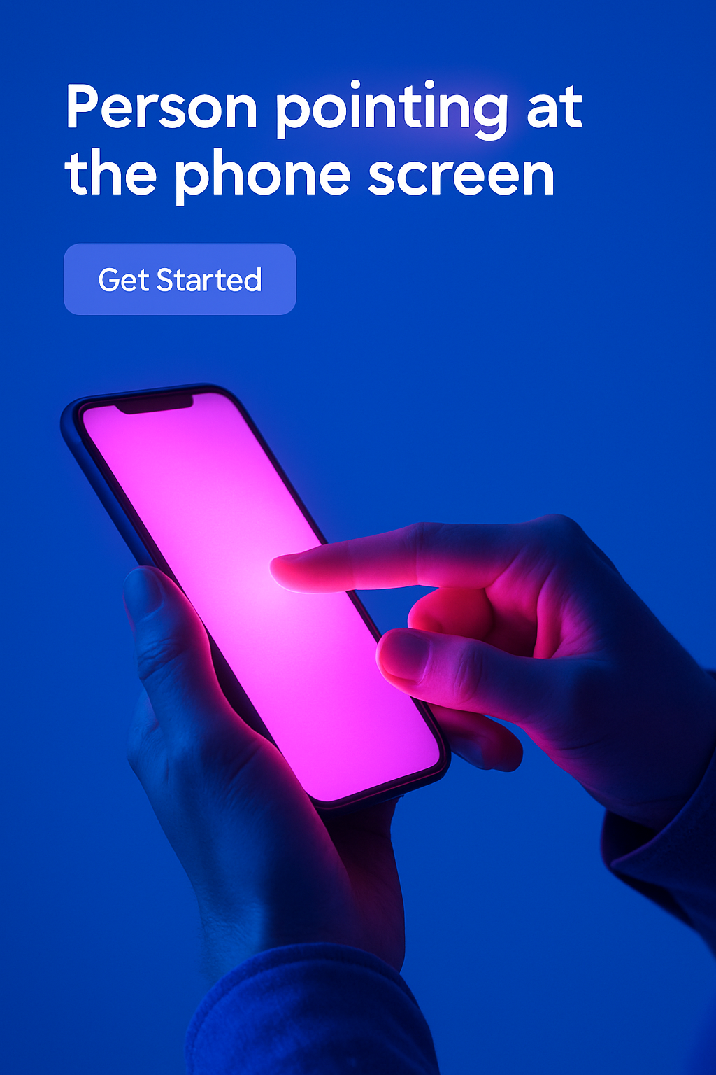 A person points at a glowing phone screen, radiating neon pink light. The solid blue background enhances the vibrant atmosphere, creating a visually striking composition.
