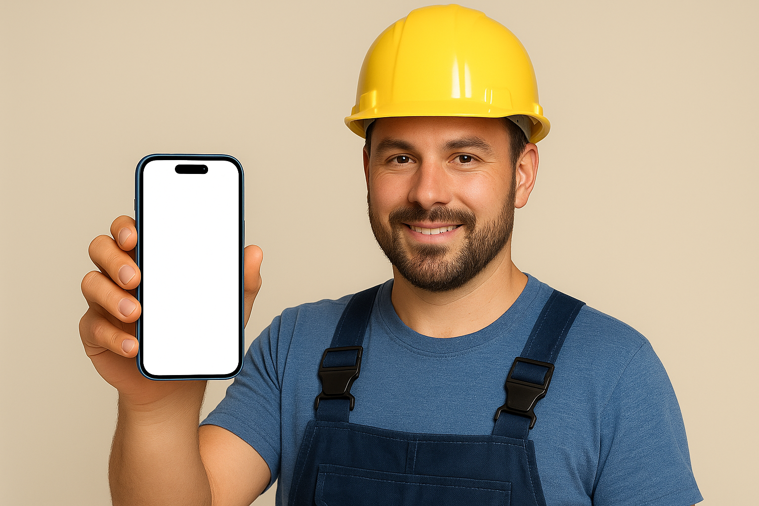 A smiling male builder wearing a yellow hard hat and blue shirt holds a smartphone with a blank white screen. The background is neutral, highlighting his cheerful demeanor.