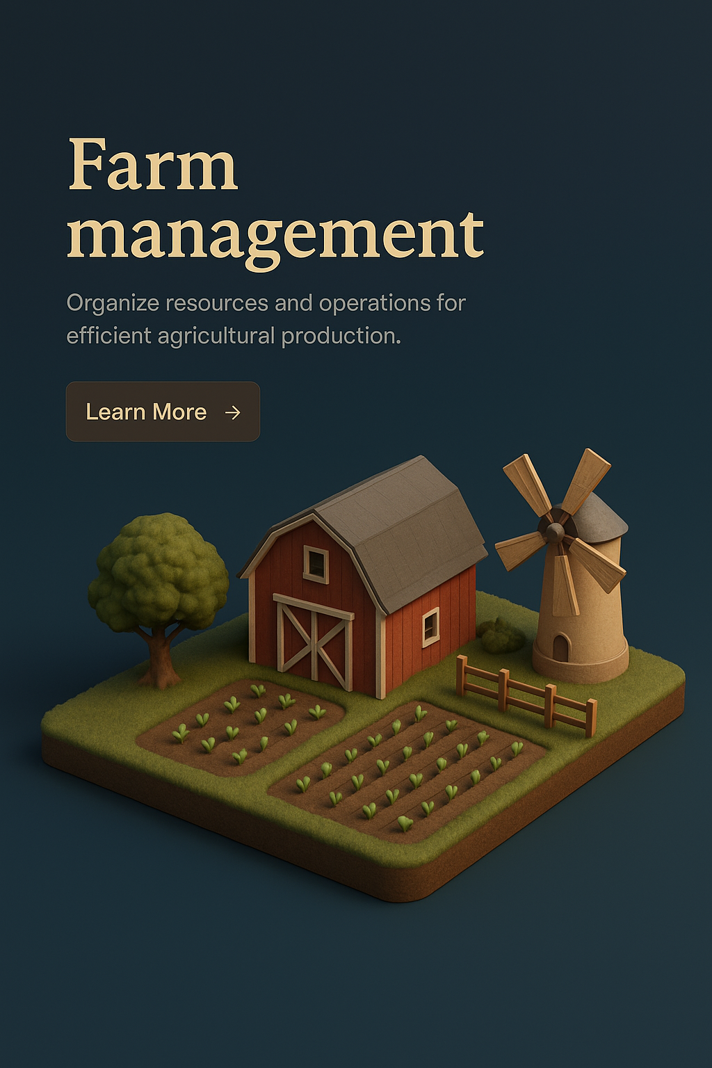 /Collection: /by davooda/Type: PNG/A realistic 3D rendering of a small farm with a barn, windmill, and crops, set against a dark gradient background. The scene is designed to showcase farm management principles.